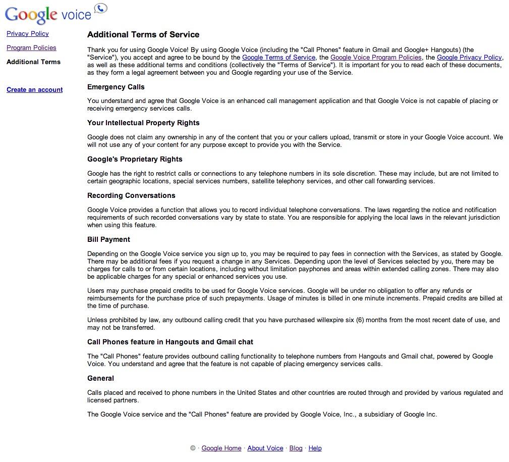 And finally, there’s the Google catch-all which you will note changes regularly (and is about to change again). So, even if you didn’t violate the Terms last week, next week may be a different story. Multiply that Catch-22 by five years in the case of Google Voice.