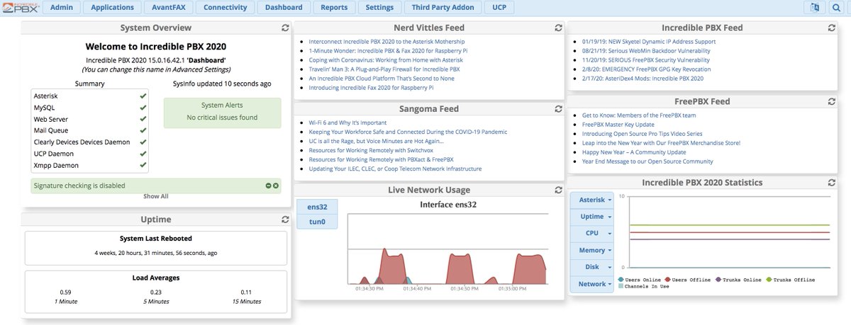 Once you log in with your admin password, the Dashboard of your server will display the status of trunks, users, and active calls on your server. In addition, you can review the latest news and security alerts from the RSS Feeds of Nerd Vittles, Incredible PBX, FreePBX, and Asterisk. For additional status information, choose Reports:Asterisk Info.